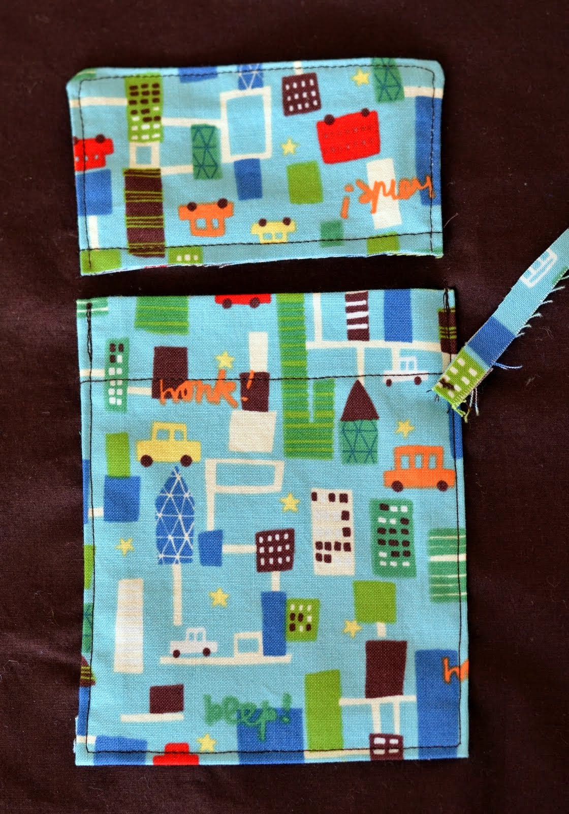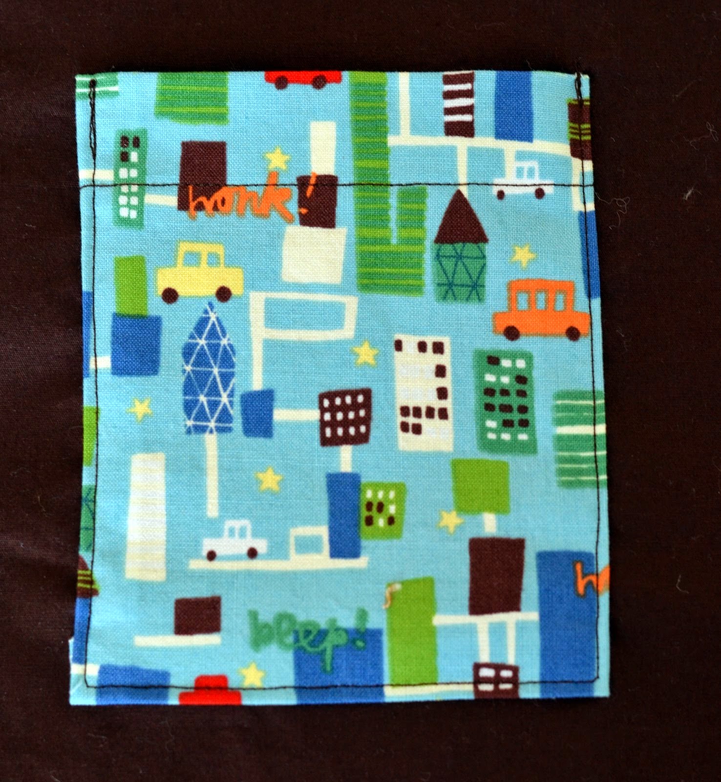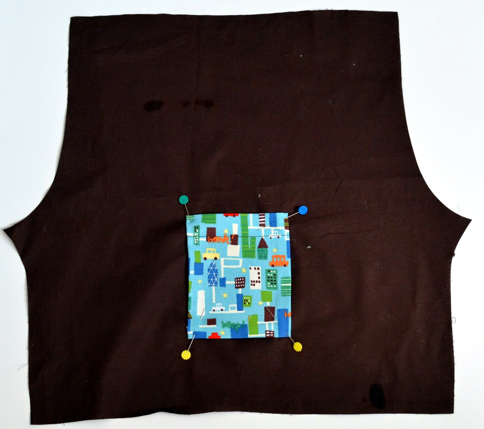 Center pocket on leg piece and pin. Stitch in place, being sure to backstitch well at the top corners.